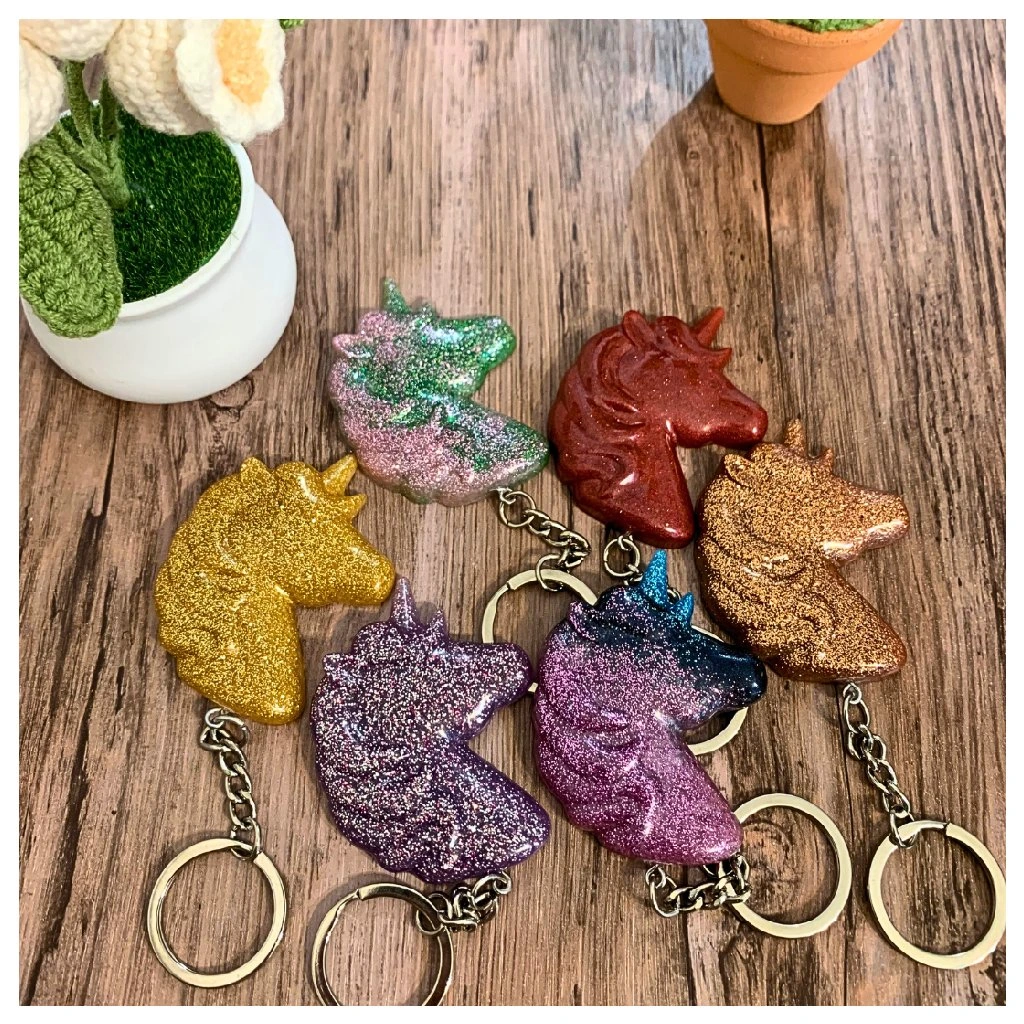 Hravý přívěsek ve tvaru jednorožce z pryskyřice s třpytivým efektem.