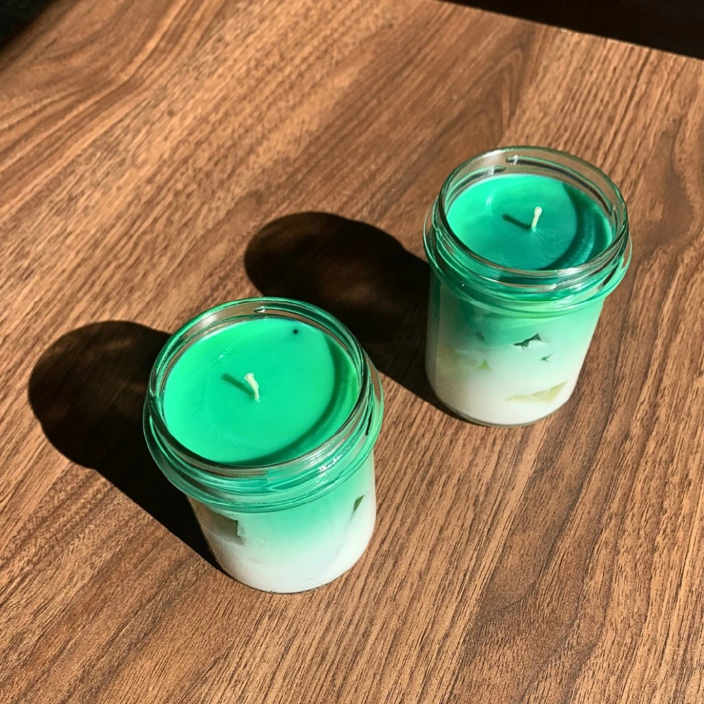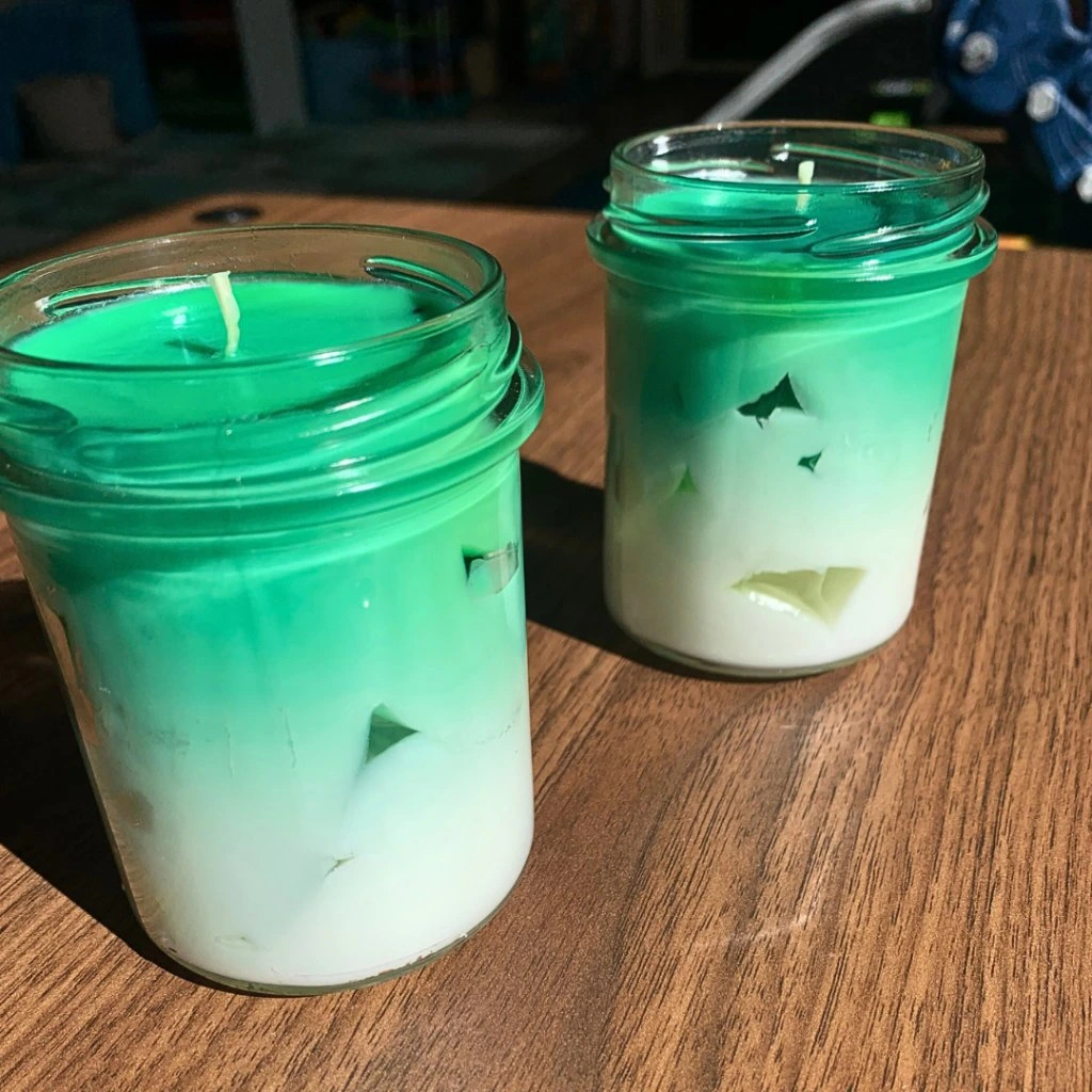 Velká sójová svíčka s vůní zeleného čaje a efektem ledových kostek z gelového vosku.