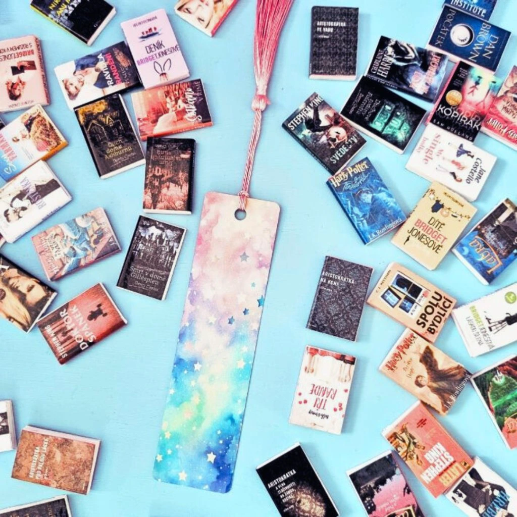 Jemná záložka s drobnými hvězdami a barevným přechodem od teplých odstínů po tmavší modrou. Působí klidně a nenápadně.